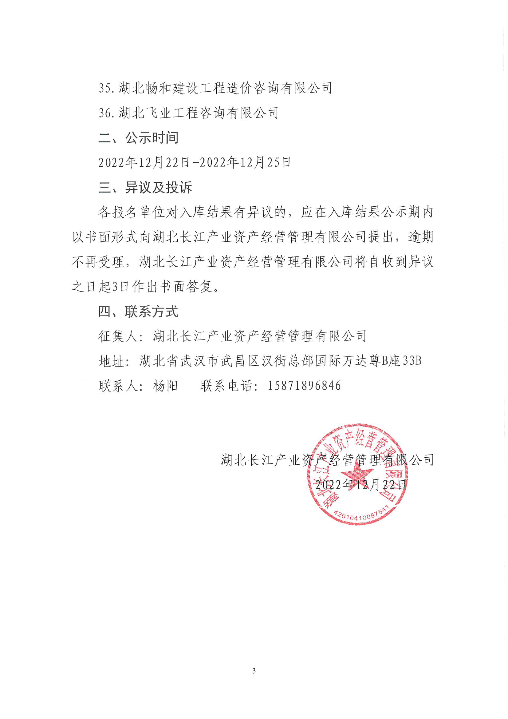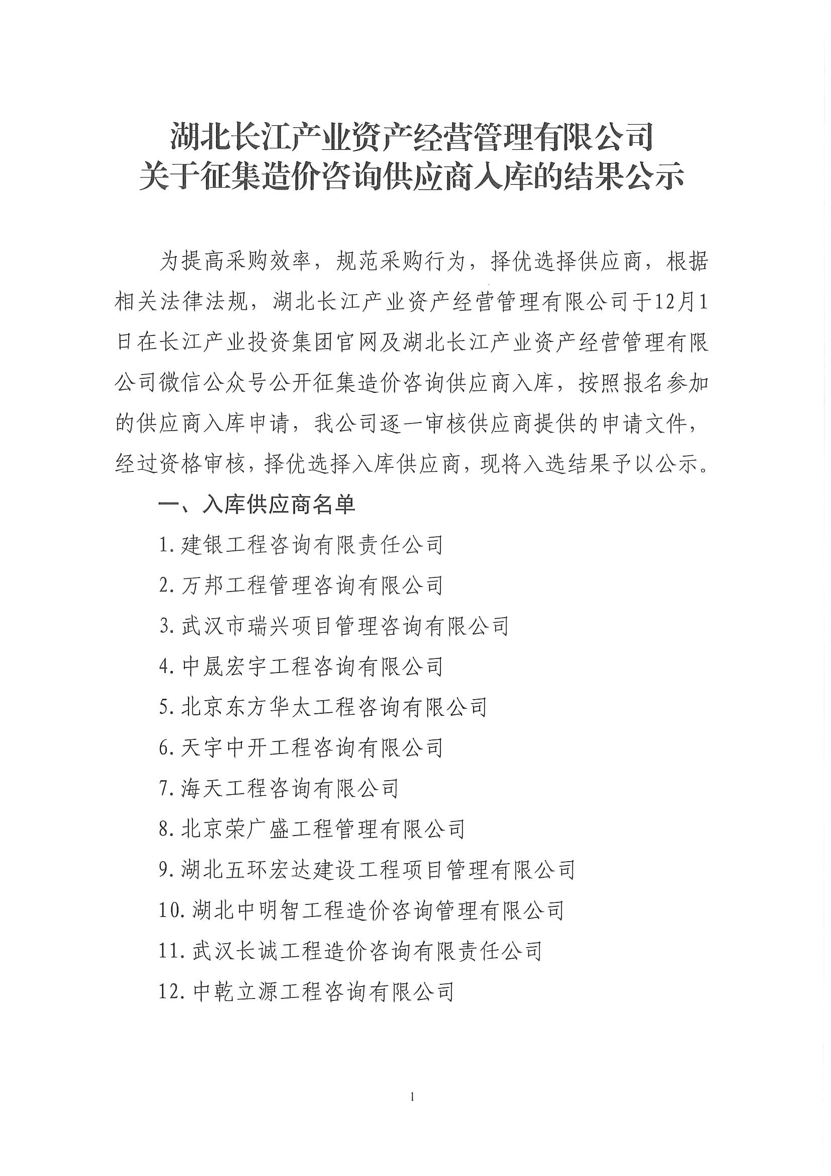 湖北九游会老哥吧俱乐部资产经营管理有限公司关于征集造价咨询供应商入库的结果公示