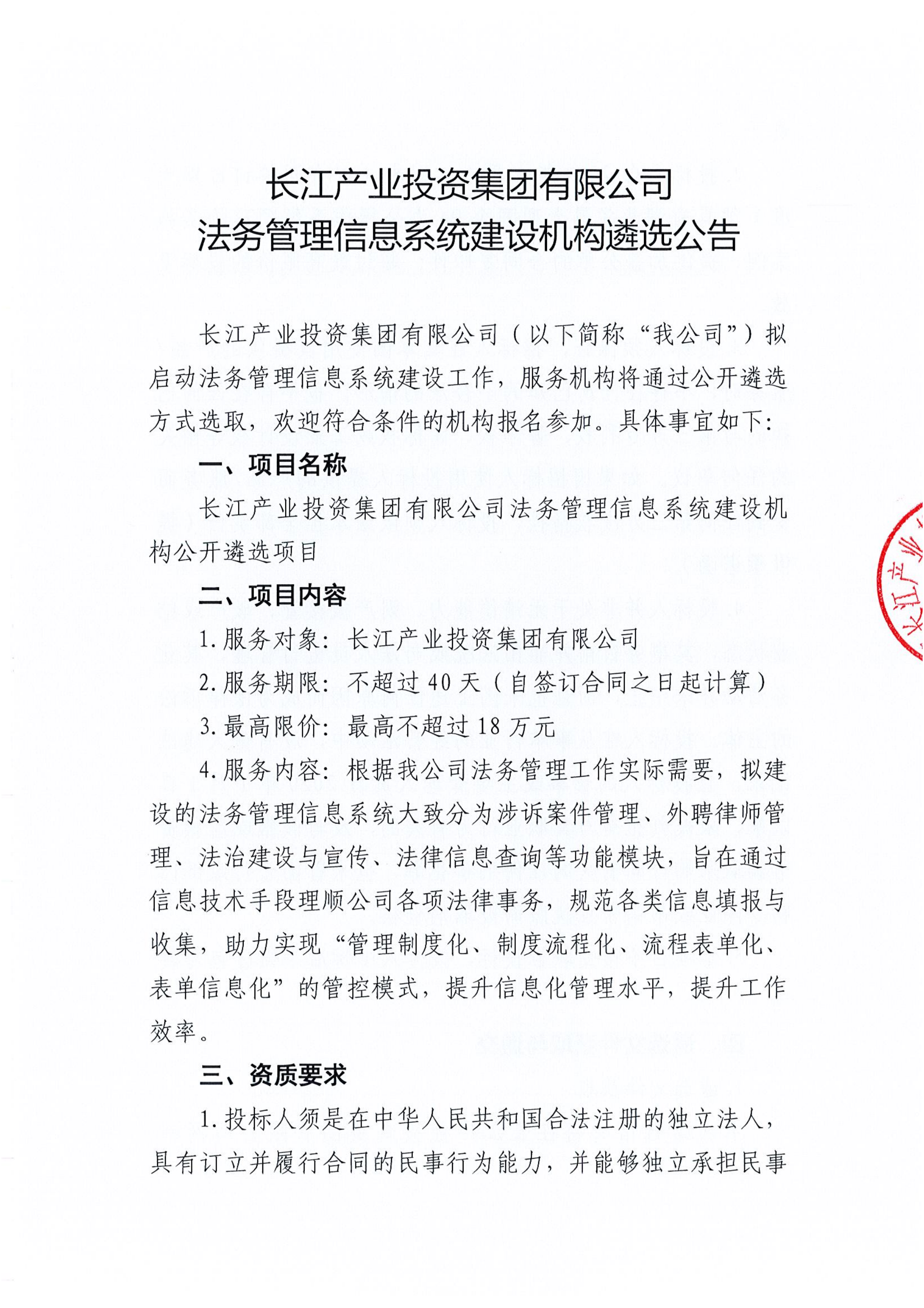 九游会老哥吧俱乐部投资集团有限公司法务管理信息系统建设机构遴选公告